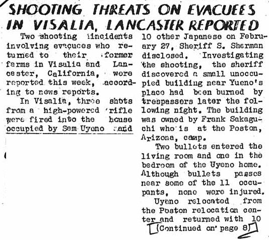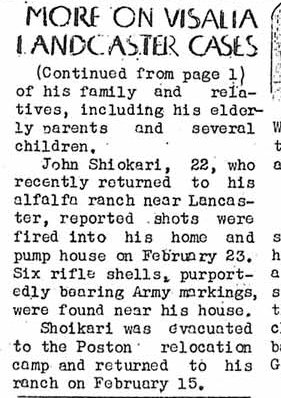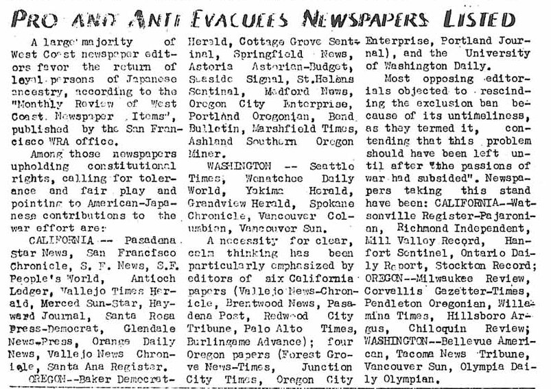 Page 1: Hood River restores names of Nisei G.I.s; center to observe new schedule; Justice Wolfe to induct council; Koos company representative arrives to recruit 20 workers; Spanish counsel arrives today.