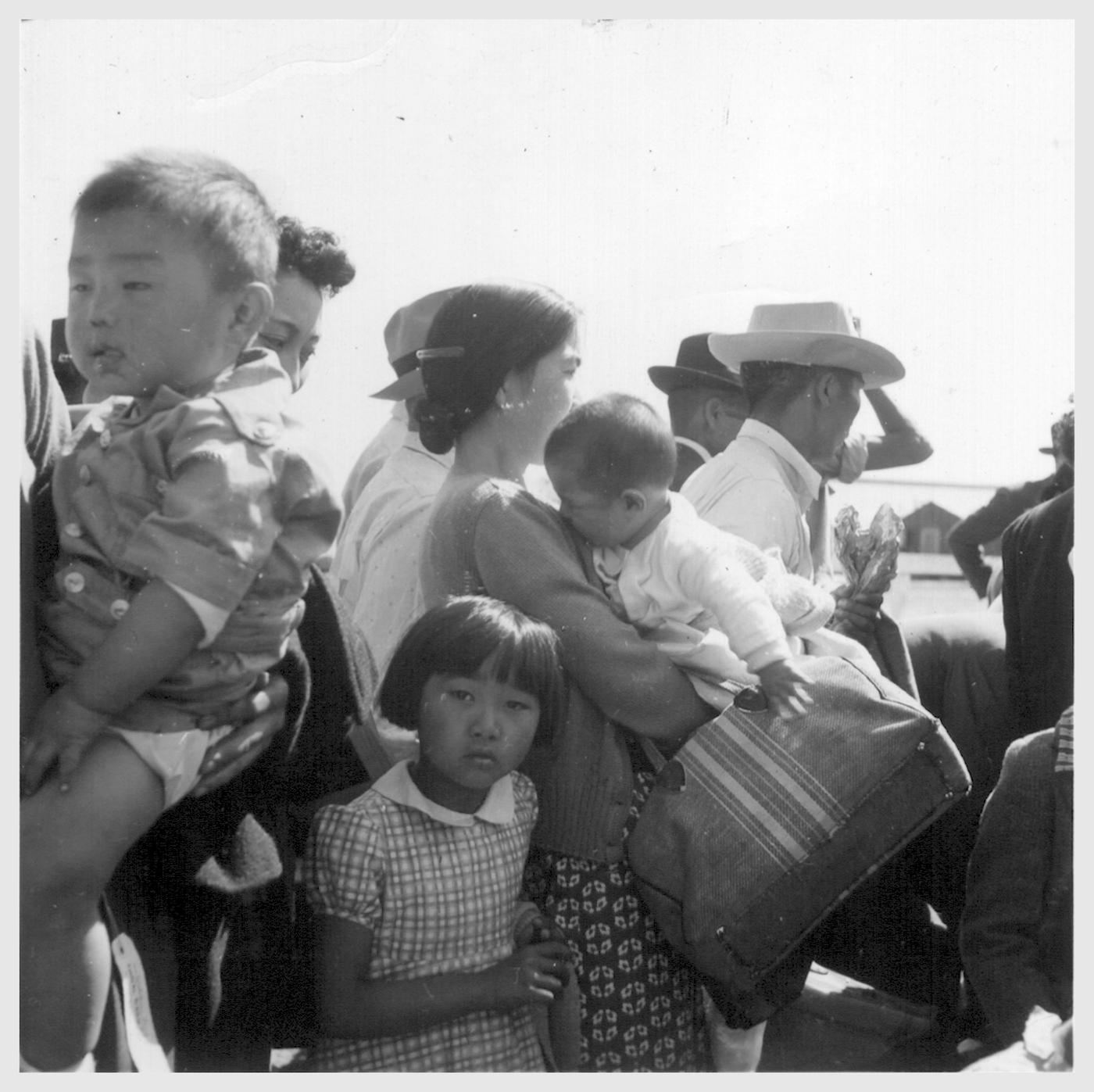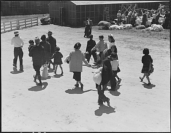 Families of Japanese ancestry arrive at Turlock Assembly center. Evacuees will be housed later at War Relocation Authority centers for the duration. 5/2/42