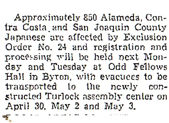 This center was on the Stanislaus County Fairgrounds. It was occupied from April 30 to August 12, 1942 and held over 3,500 evacuees. (Maximum population of 3,661) After the evacuees left it was used as an Army rehabilitation center, whre army prisoners received special training and discipline before returning to military service. There are no historical markers and nothing left from the assembly center.