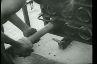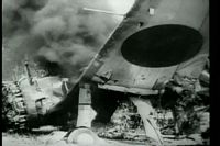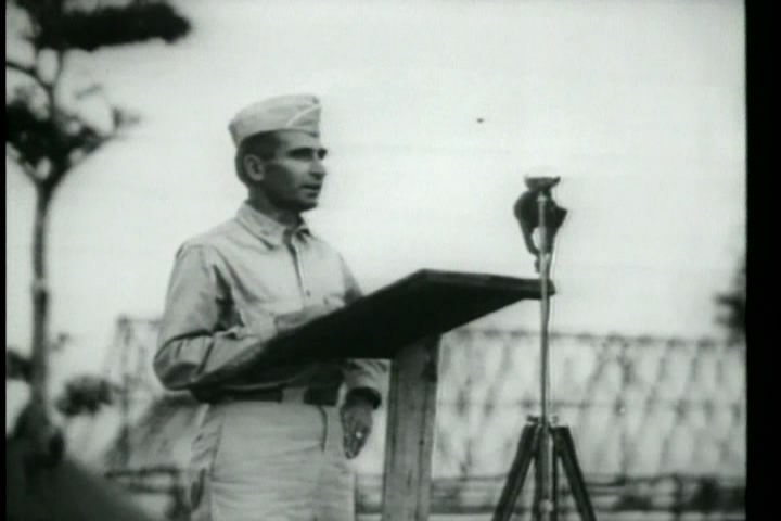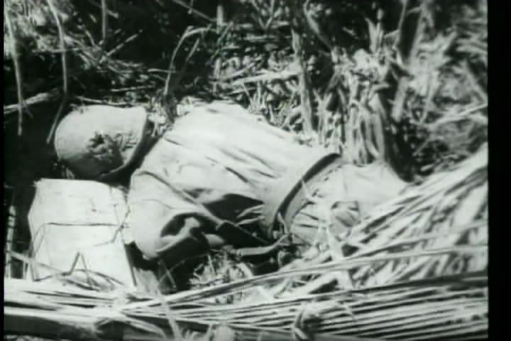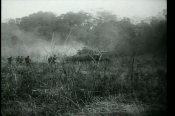 Again, Marines on foot work closely with a tank to advance on the enemy.(Again, there are closeups of dead Japanese soldiers.)