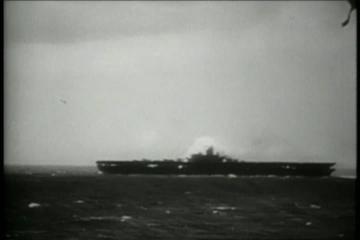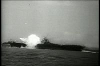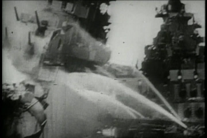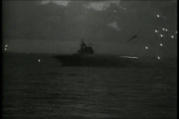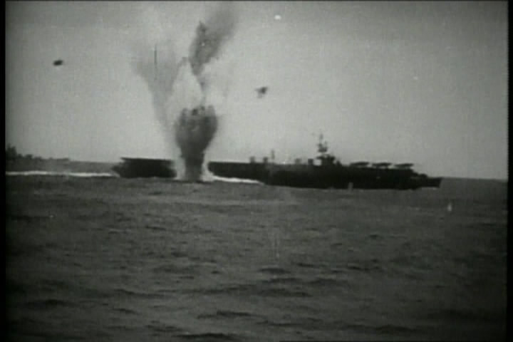 U.S. planes manage to shoot down many of the kamikaze, and anti-aircraft fire takes many more, but some still make their way through and crash into U.S. ships.
