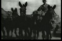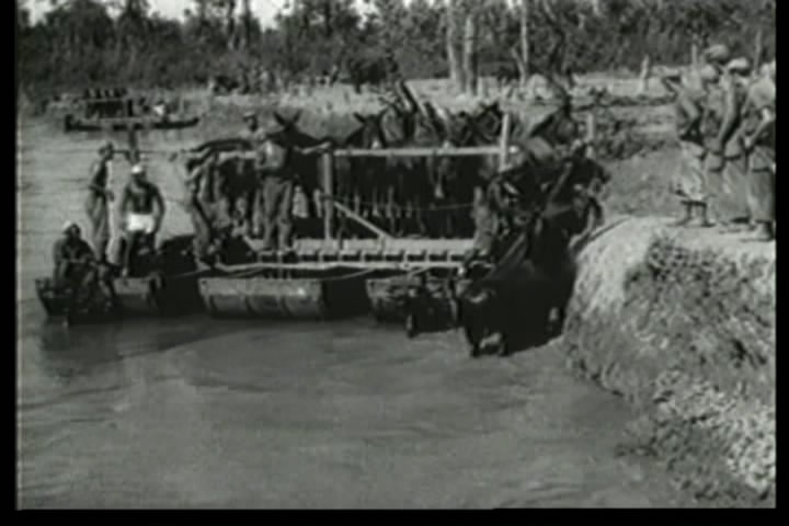 The mules are tied to the ferry, but some of them fall into the water anyhow.