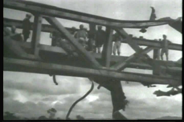 A railway bridge that had been under Japanese control was bombed by Americans and is now under Allied control and is being repaired.