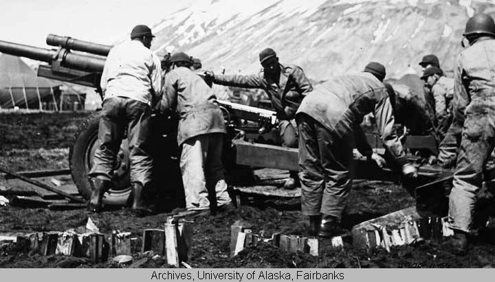 "This 105-mm gun and its crew poured more than 2000 rounds of shells into Jap positions in the course of four days battling at Attu. Jap positions blasted were in the Massacre-Chichagof Pass. With the Aleutian base again in American hands, Japs stationed on Kiska are becoming the center of attraction for our bombers in the cold country."