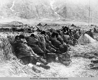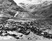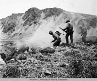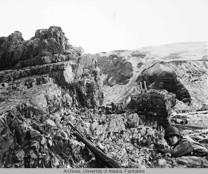 "As American troops landed on Attu, Aleutian Islands, May 11, 1943, a navy combat photography unit accompanied the first wave of American troops ashore at Japanese-occupied Attu, the westernmost island of the Aleutian chain. Some of the photos -- such as this -- was made under fire as the Japanese snipers in the hills in the background - half hidden by fog attempted to wing our men shown in the foreground near Massacre Beach. The Japs skillfully camouflaged came down to the line of fog and fired from the crevices in the rocks. Credit line (U. S. Navy official photo from Acme) 5/26/43. (50) W10133"