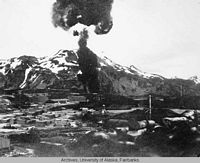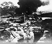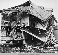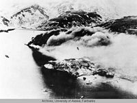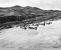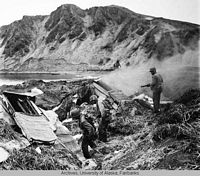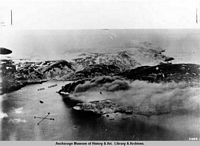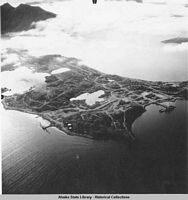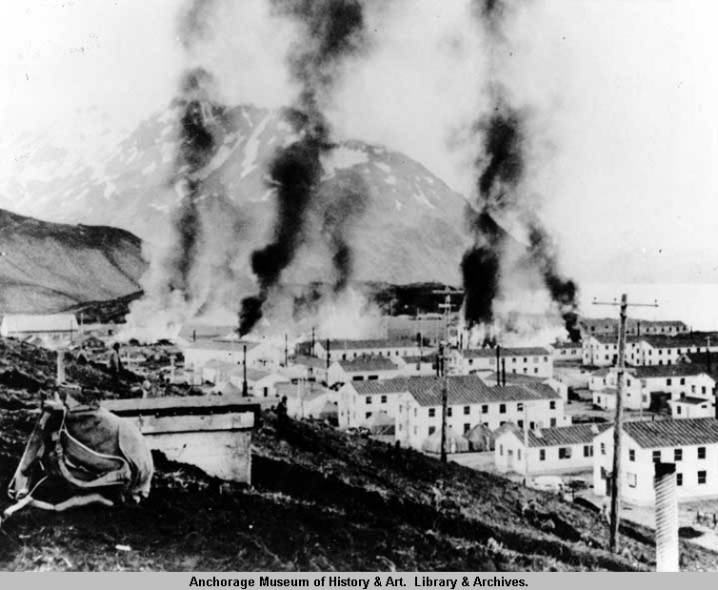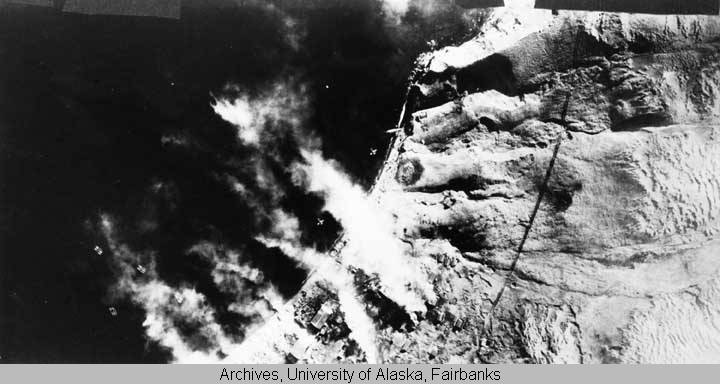 View of bombing of Fort Mears at Dutch Harbor, Unalaska Island, Alaska, during World War II. From verso: "News release. Headquarters, Alaskan Command. Public Affairs Division, Elmendorf AFB, Alaska 99506. Phone Anchorage, Alaska (907) 752-9215 or 752-9222. Historical photo series. Japanese bombing attack - Not only was Pearl Harbor unprepared on the "Day of Infamy," December 7, 1941, but Alaska lay practically defenseless. Nowhere in its vast reaches could be found a single Army, Navy or air base ready to repel the enemy. Dutch Harbor was bombed by carrier-based Zeros of the Imperial Northern Force of the Japanese Navy on June 3-4, 1942. This photo was taken of Fort Mears following a bombing attack. Three days later, and exactly six months after Pearl Harbor, the Japanese landed almost 2,500 crack troops before dawn on the beaches of Kiska and Attu in the Aleutians -- U.S. soil." 1942. Photographer: Alaskan Command. Original photograph size: 8" x 10".
