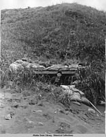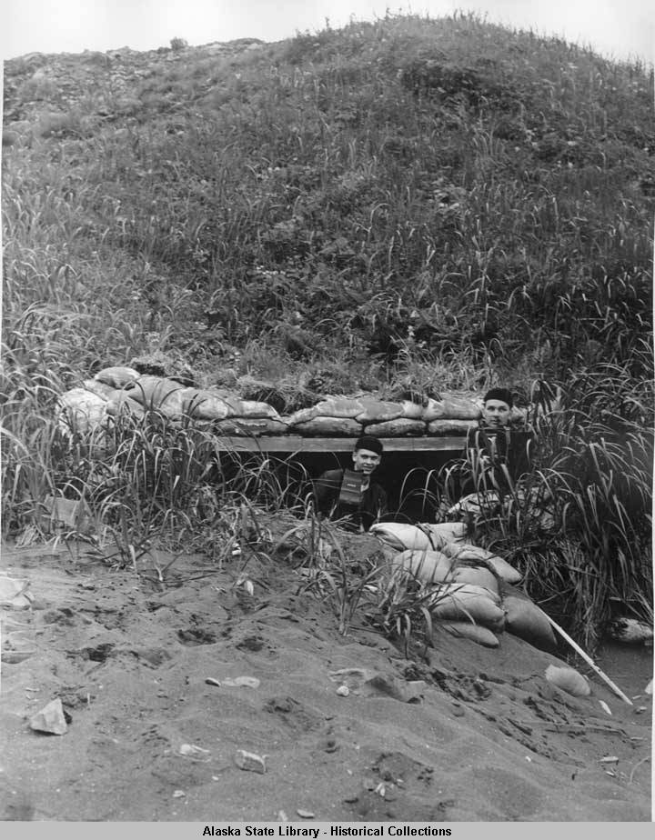 Washington D.C. -- This photo, one of the first taken of the landing of U.S. Troops on Jap-held [ Japanese held ] Attu Island last May 11th, was taken by a navy combat photographer and released in Washington today. Cameramen who took these photos of the landing at two points on the island, Massacre Bay and Holtz Bay, were under Jap fire many times. Here, by crawling on his stomach, photographer was able to get this closeup of American machine gun nests in the front lines of Attu.