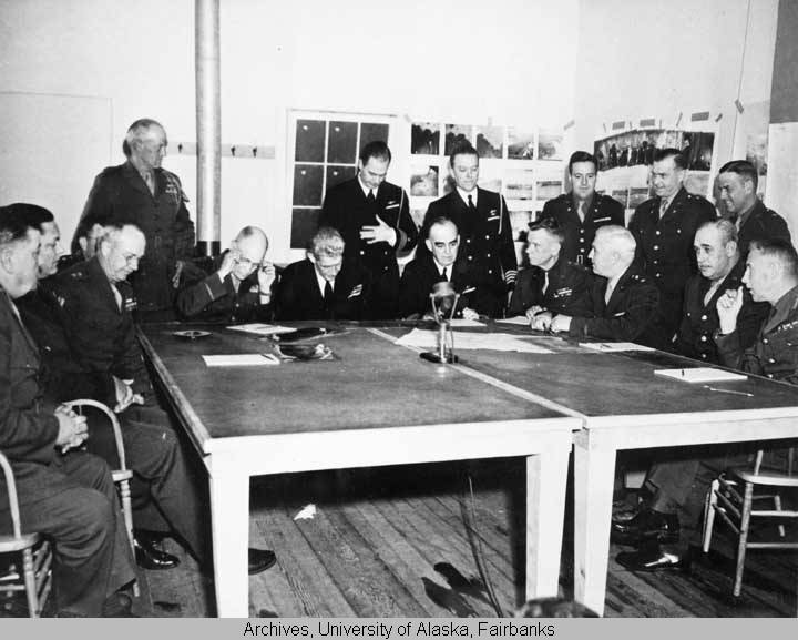 "American and Canadian troops have occupied Kiska, vast Japanese stronghold in the Aleutians, without meeting opposition from the enemy, it was announced on Aug. 21st. This photo just received from the front shows high ranking officers of Army, Navy, Marine and Air Corps, who planned Invasion B land, sea and air as they met shortly before the start of invasion in Admiral Kinkaid's conference room at North Pacific Fleet Headquarters at an Aleutian port. Left to right -- seated around table -- Maj. Gen. J.B. Murchie, Canadian Army; Commodore L.E. Gehres, Commanding Officer of Fleet Air Wing Four; Maj. Gen. Holland M. Smith, Commanding General U.S. Marine Amphibious Corps; Brig. Gen. James W. Barnett, (hidden) Lt. Gen. John L. DeWitt, Commanding General 4th Army; Rear Admiral Grancis W. Rookwell; Vice-Admiral Thomas Kinkaid, Commander of the U.S. North Pacific Fleet; and Commander-in-Chief of the Kiska Invasion; Major General Charles H. Corlett; Lt. Gen. Simon Bolivar Buckner, Jr.; Major General William Butler; Maj. Gen. George Randolph Pearkes, Commanding Canadian forces: (standing in rear) Col. G.B. Erskine; Commander R.L. Dennison; Capt. O. S. Colclough; Col. Carl T. Jones; Brig. Gen. E.D. Post; Brig. Gen. J. L. Ready. (50) Credit Line (Acme) (WP) 8/21/43"