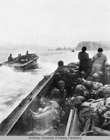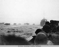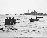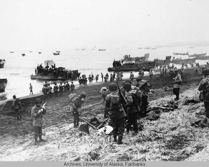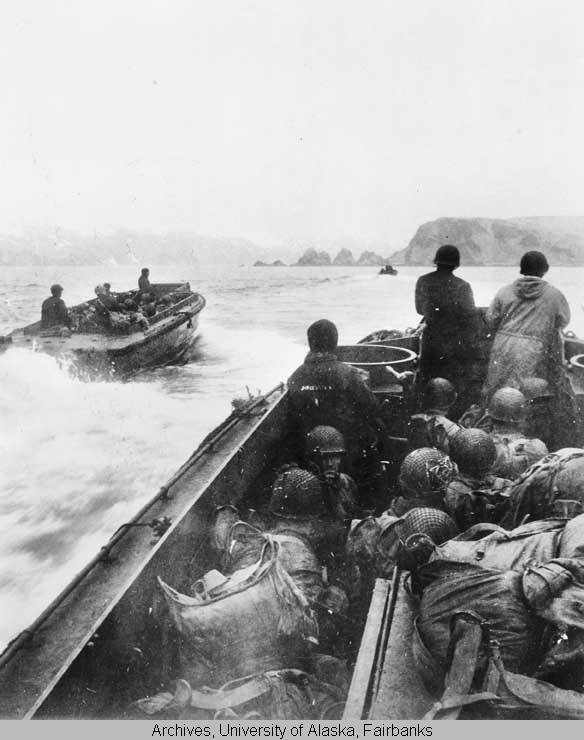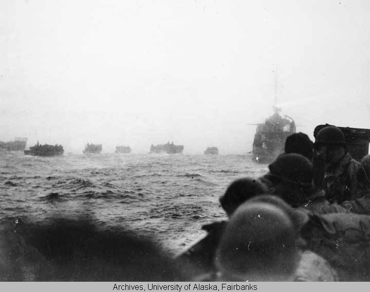 "As American troops landed on Attu, Aleutian Islands, May 11, 1943, a navy combat photography unit accompanied the first wave of American troops ashore at Japanese-occupied Attu, the westernmost island of the Aleutian chain. This photo was made at the start of the attack and shows that landing boats having been put over the side of the transports are beginning to move towards the beach. The searchlight of the destroyer cuts thru the fog like a pencil.