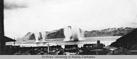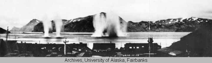 "Here in one of the first offical Dutch Harbor bombing photos released by the U.S. Navy is shown a series of bomb explosions in the bay where raiders "unsuccessfully" attempted to silence machine gun fire." Date attributed to this photo notes when censors released image for reproduction. Attack here probably happened in early June 1942.