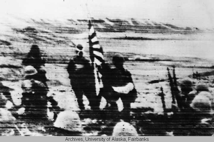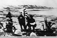 "Tokyo -- Japanese troops are raising their flag after the landing in the Aleutian islands, according to the original caption accompanying this photo, which was received in New York from neutral Portugal, August 1. Lisbon described it as a radiophoto from Tokyo to Berlin.