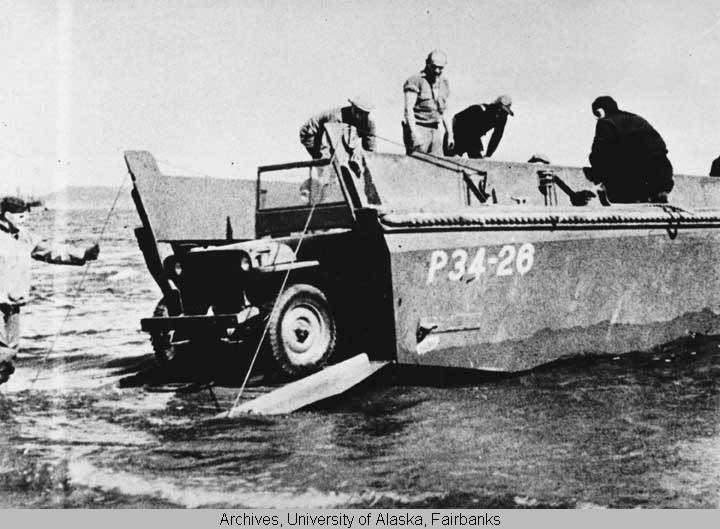 "A jeep noses its way shoreward from a snub-nosed landing barge. By occupying this island which is only about an hour's flying time from Japanese-occupied Kiska, the American Airmen are able to keep the Nipponese under constant aerial bombardment.