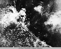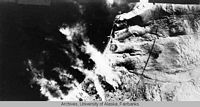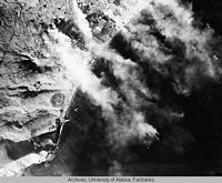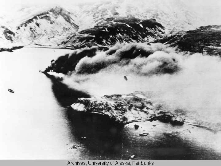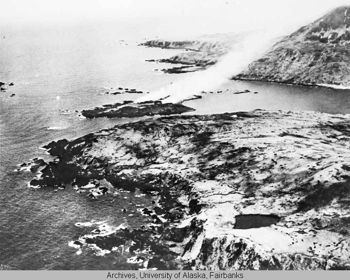 Photograph of smoke rising from a small island (Kinnaw) after a bombing run. Verso reads: "Smoke rises from fires started by American air and ground forces on the small island of Kinnaw, off Chicagof Harbor, Attu, where the Japanese made their last stand. A U.S. Navy plane flew over the shell and bomb pocked hills to make this photo on May 31st. NY LON SA MX SJ #12 6/16/43 Credit line (official U. S. Navy photo from Acme). W688586"