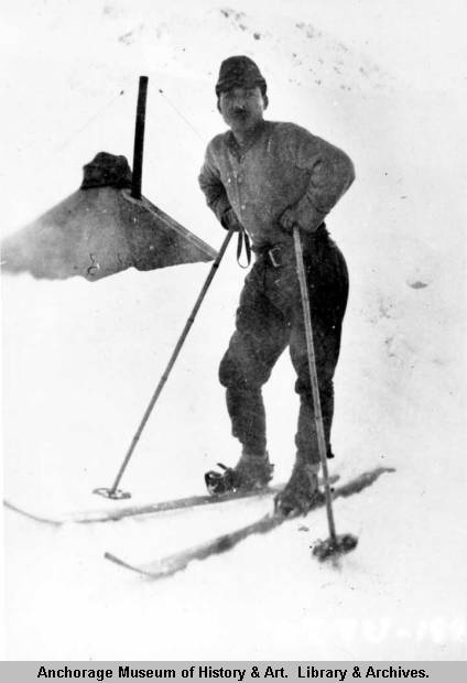 View of Japanese soldier skiing, Attu Island, Alaska, during World War II. Photo among those later found on Attu after its capture by the United States. From front: "Attu, 1943." 1943. Original photograph size: 7" x 5".