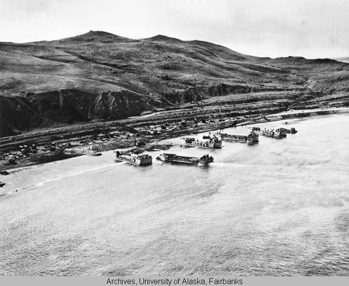 "Americans occupy island 63 miles from Kiska Amchitka Island, Aleutians--In the cold waters of Constantine Harbor, Yank landing boats head toward Amchitka Island in the Aleutians only 63 miles from Jap-held [ Japanese held ] Kiska. The ocupation, announced today (May 7) by the Navy, took place last January. No opposition was given the Americans who carried out the landing party according to plan. Amchitka is now the nearest U.S. base to Tokyo and places our long range bombers within theoretical range of the Jap capital.