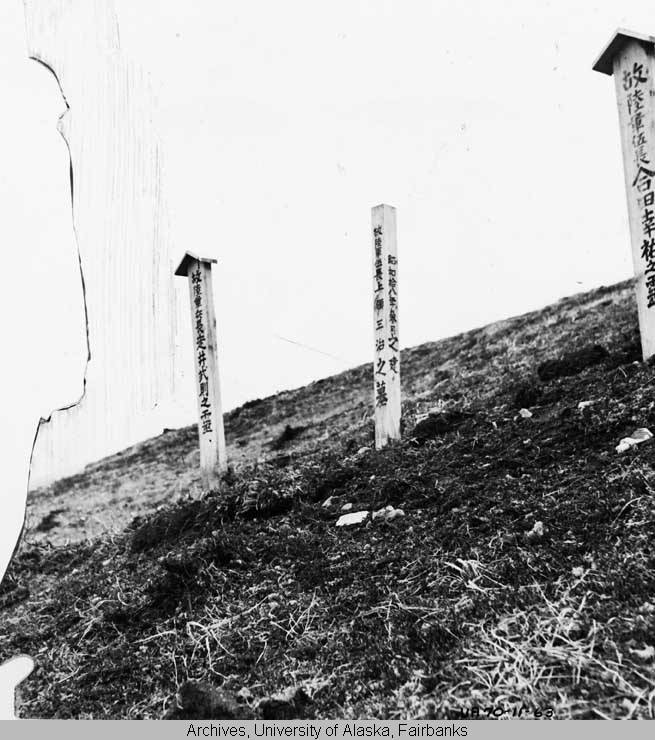 "An American doughboy looks at a tiny Japanese graveyard found on Attu when he reached the west arm of Holtz Valley after a drive over the mountains to complete a victory."