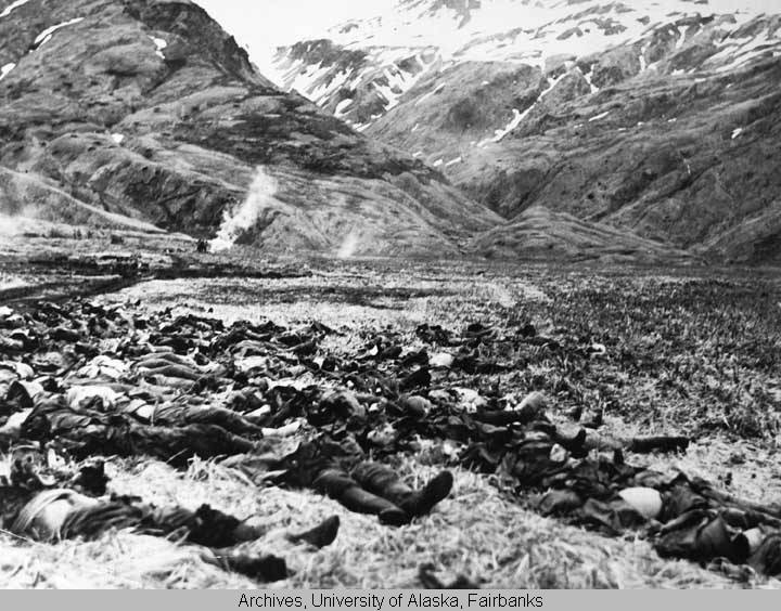 "Attu -- Every one a bloody, gruesome corpse with a part of his body torn away, these Japs died by their own hand in a mass suicide on Attu, in the Aleutians. Most of the Nips [ Nipponese ] died when they held hand grenades to their chests. The smoke in background rises from an American supply dump left burning by the Japs .