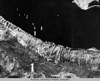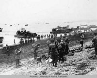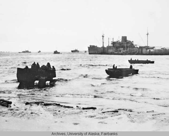 "As American Troops landed on Attu, Aleutian Islands, May 11, 1943, a navy combat photography unit accompanied the first wave of American troops ashore at Japanese-occupied Attu, the westernmost island of the Aleutian Chain. Some of the photos were made under fire -- as Jap snipers attempted to wing our men. In this photo landing boats are shown pouring out scores of soldiers and their equipment onto the black volcanic sand of Massacre Bay. This picture represents but part of the southern landing force."