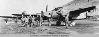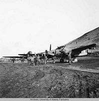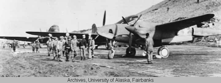 "Occupation of Amchitka Island in the Aleutians provides U.S. airmen with a base only 63 miles from Jap-held [ Japanese held ] Kiska and within 1700 miles of Tokyo. Here American war planes are shown on a newly constructed airfield on the island."