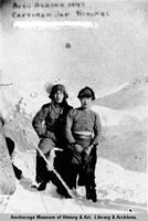 Title taken from front. Two Japanese soldiers pose in snow on Attu Island, Alaska, during World War II. Photo among those later found on Attu Island after its capture by United States. From verso: "Property of Cook Inlet Historical Society." 1943. Original photograph size: 5" x 3 3/4".