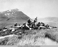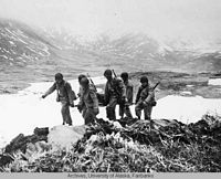 "As American troops landed on Attu, Aleutian Islands, May 11, 1943, a Navy combat photography unit accompanied the first wave of American troops ashore at Japanese-occupied Attu, the westernmost island of the Aleutian chain. Some of the photos were made under fire -- and we too had our casualties. A detail of soldiers from an advanced command post carry back a wounded comrade. This picture clearly reveals the rough terrain over which we went after the Japanese. Their snipers kept just above the fog line and hi[s] in crev[i]ces. (50) 5/26/43Credit line (U. S. Navy official photo from Acme.)"