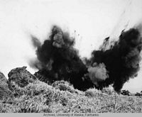 "Attu Island -- With a roar, a Japanese shell explodes near a U.S. position. The Nips fought furiously and clung to their foxholes with the tenacity of cornered rats -- but they were doomed men. Credit line (Acme) (WP) 6-9-43 (ML) Full DJH LV MIL. MON 687869 WP New York Bureau"