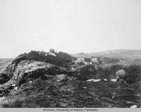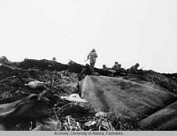 "Attu -- Guns in hand, a mop-up squad moves in to clean up this Jap gun emplacement on the west arm of Holtz Bay. The two Japs who held the position refused to surrender. Smoke can be seen still risinig from the spot where hand grenades were tossed to wipe out the stubborn pair of Nips.