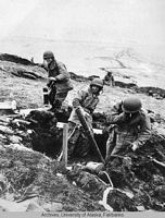 "Right in the thick of action on Attu, hurling their trench mortar shells over a ridge into a Japanese position, these soldiers go about their job casually. Note the expressions as two of them wait tensely for the explosion. A third, with head down, speaks into a field telephone, a cigarette dangling from his lips. This is the first close-up of land battle action on Attu to be released. NY LON SA 12 MUR 6/4/43 (JR) credit (Official U. S. Navy photo from Acme) W 687397"