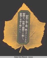 Accession Number: 96-26 Descriptive Narrative: Paper cut-out in the shape of a paulownia leaf, printed in gold, black and green. Background printed on each side is a photographic reproduction of a leaf in gold and black. In the center is a black rectangle with green border around Japanese characters. Inscription: inscription in Japanese