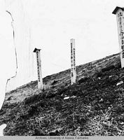 Further information was provided by Ron Inouye, co-investigator on the Alaska's Japanese Pioneers Oral History Project, December 10, 2005, in Fairbanks AK. "During World War II, Japanese men, legally barred from U.S. citizenship, were separated from their families and Japanese-Americans, and placed in Department of Justice internment camps. Several Alaskans were taken from rural Alaska to these camps in Crystal City, TX and Santa Fe, NM. A permanent memorial to the internees was dedicated in Santa Fe in 2002."