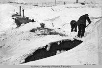"Soldiers at a U.S. Army base in the Aleutians do a little old-fashioned snow shoveling to clear important points after a williwaw (howling blizzard to you) that has covered their huts with snow. Winds that reach 100 miles an hour, squalls and fog as thick as clam chowder are some of the natural enemies combatted by American soldiers on the island chain that stretches across the North Pacific like stepping stones between Japan and Alaska."