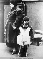 "Victims of war are these Aleuts who were evacuated from their homes during the installation of Alaskan defenses. Natives earned money in sealing operations, became customers of mail-order stores. Native costumes and handicraft have yielded to factory-made articles." [handwritten on the back]"Agnes Lekanoff of the Pribiloff Islands;" "Anna Lekanof;" "People evacuated from St. George Island."