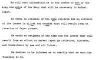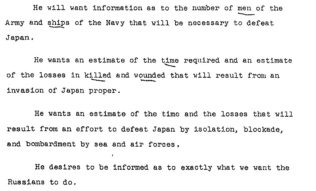 The President wants to know just how many men and ships will be needed to defeat Japan, how long it will take, and what the casualties will be if Japan itself was invaded. He also wanted to know how long it would take to defeat Japan, and what the losses would be, if we kept to a plan of isolation, blockade, and bombardment, but no direct invasion of the home islands.