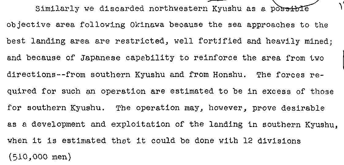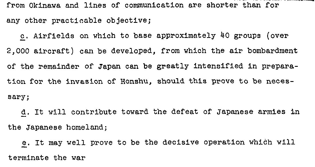 It also notes that it is possible that sections of the Japanese military on the various islands, etc, would refuse to surrender even if the central government surrendered, so it was possible that, even if Japan itself surrendered, fighting against these isolated (and usually bypassed) groups would have to continue.