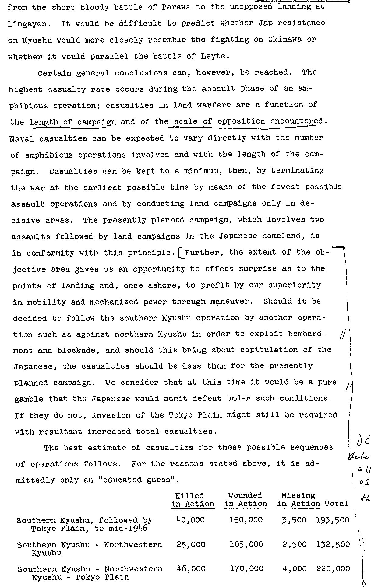 The document goes on to talk about surprise as to landing areas, yet the Japanese knew full well just where the U.S. was going to land, on what beaches, and pretty much when. The document then comes up with its own casualty expectations.
