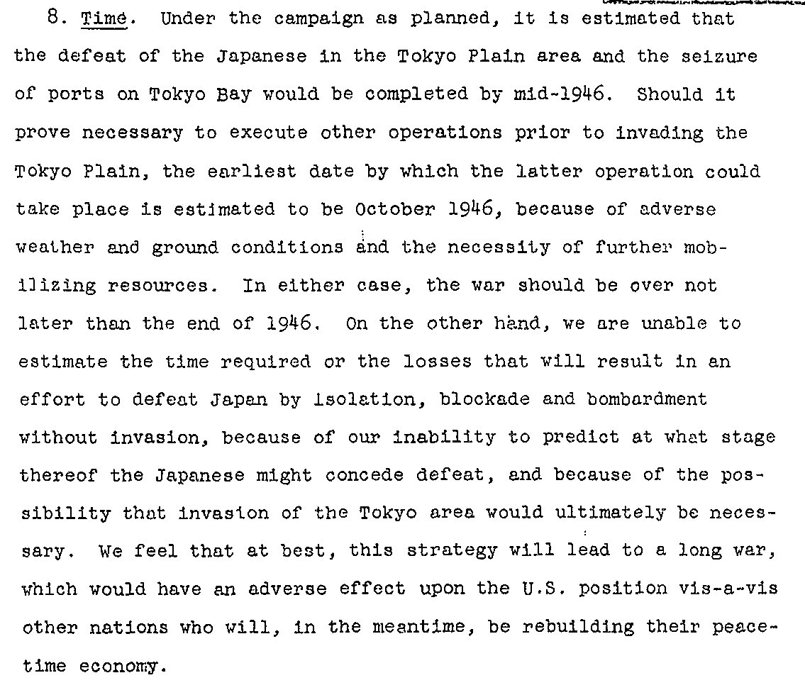 Although there were no specific, detailed plans (supposedly) for the attack on the Tokyo Plain, the date for the invasion was set for around March 1 of 1946. Increased bombing of Japan would be taking place (probably firebombing), and the blockade would be tightened.