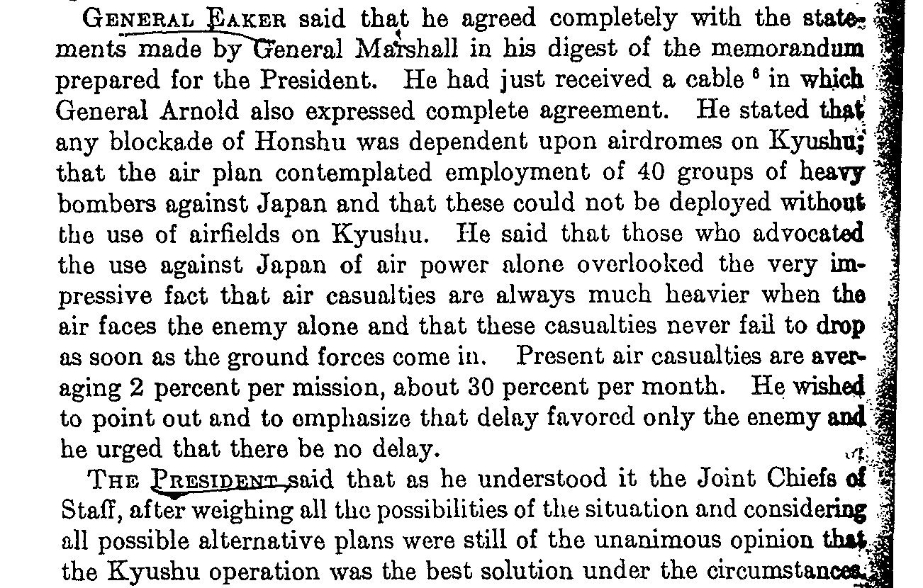 Admiral Leahy said that the rate of casualties in Okinawa would probably be equaled in an invasion of Kyushu, and that was a 34% rate of casualties. Admiral King thought that the number would be lower since there was a lot more room to maneuver on Kyushu then there had been on Okinawa. What was not discussed, apparently, was the intensity of the kamikaze attacks that would happen. It's likely that it would have been the worst wave of kamikaze attacks of the entire war.