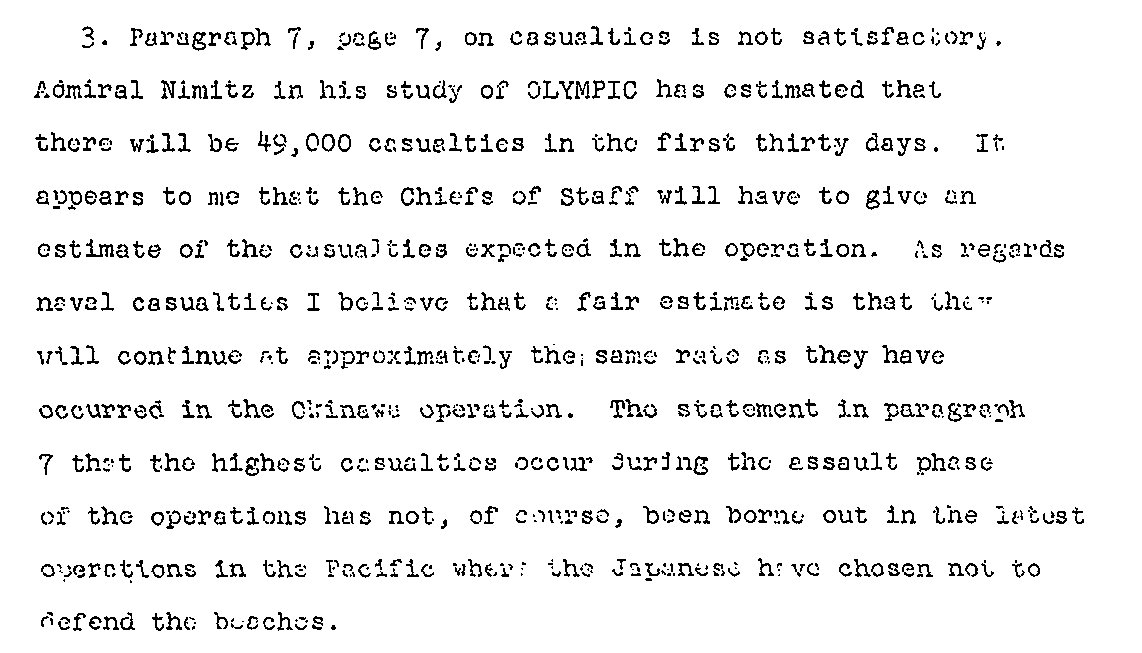 Fixing the number of casualties that would occur in Operation Olympic, the invasion of Kyushu, was a very, very difficult task. It was revised on more than one occasion, and numbers ran up to around a million casualties in total. All this was very important because the military knew that the public in general would have a very hard time putting up with a huge number of casualties. The public might want the government to accept some kind of peace settlement rather than the unconditional surrender that the government was demanding.