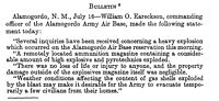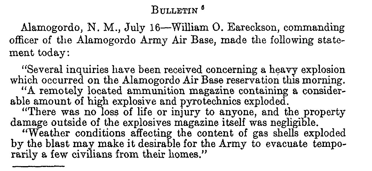 A bulletin for the press explaining away the light and sound from the explosion as being the explosin of an ammunition dump.