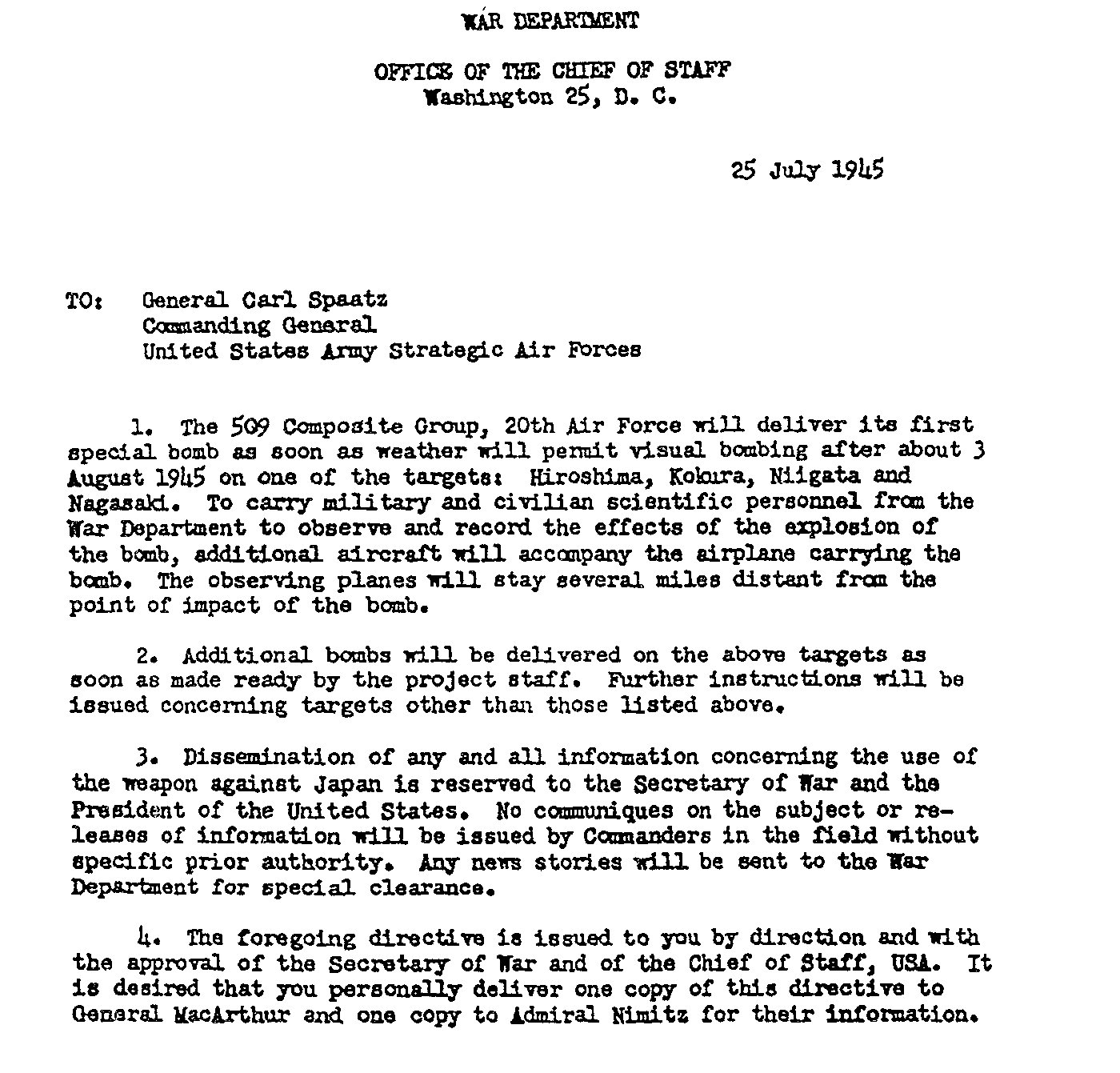 This document can be found in many sources. Spaatz reportedly carried it with him when he departed for the Far East on 24 July (Far East time] to take over a newly created Air Force command role. He was under instructions to deliver the document personally to MacArthur and Nimitz.