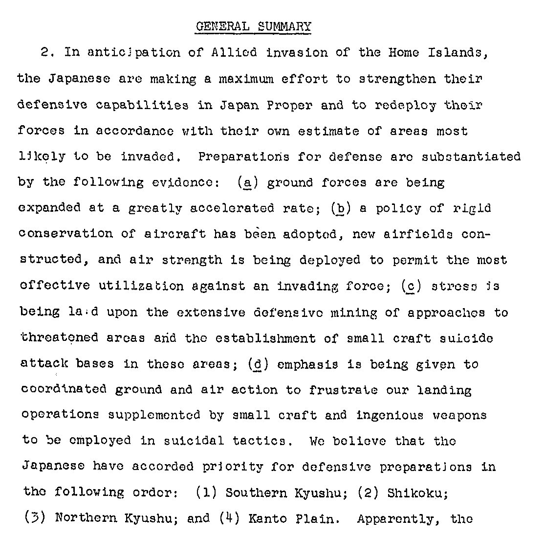 The basic overall message from this is that the Japanese had made a lot of preparations for the invasion, and there were more troops and planes than expected, and there was going to be a very liberal use of suicide tactics, including boats and planes both. In plain words, the invasion of Kyushu was going to be a lot harder than expected, which would mean there would be a lot more casualties than expected.
