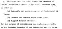 This part of the document notes the date for the invasion, which would have been November 1, 1945. It notes that the purposes are to “intensify the blockade and aerial bombardment of Japan” (which could have been done without an actual invasion); to “contain and destroy major enemy forces”, and to set up things so the “industrial heart” of Japan, a.k.a. the Tokyo area, could be invaded.