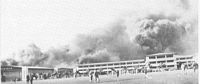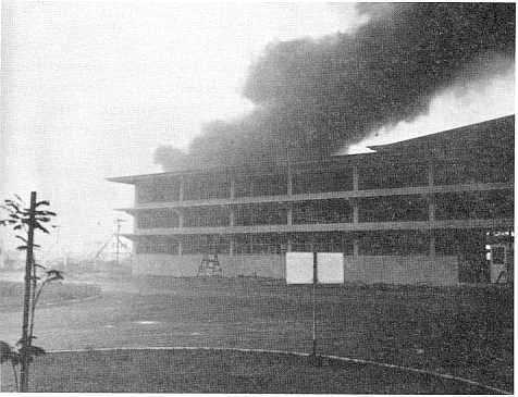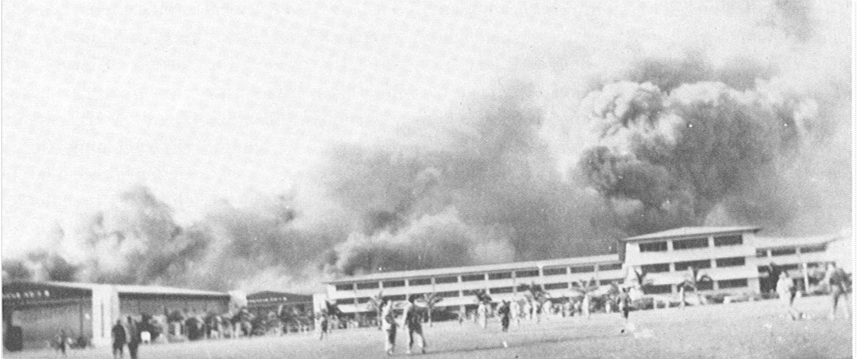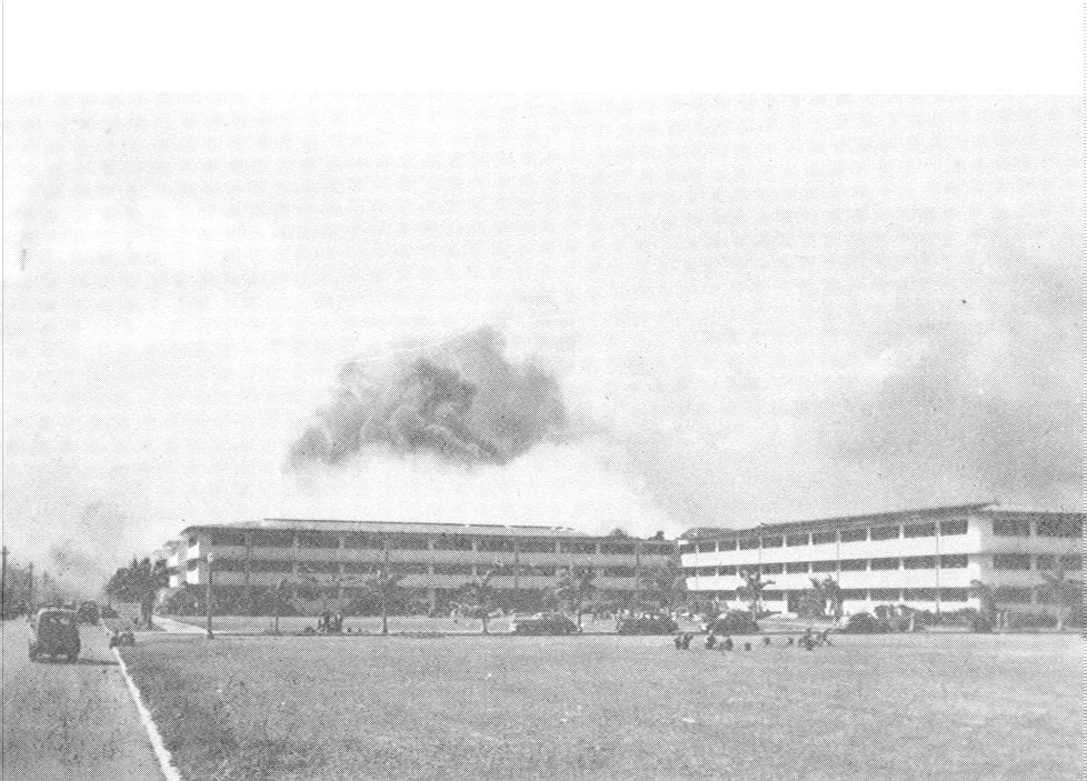 Hickam Field's big barracks, still burning from the Japanese attack, with Hangar 3 visible to the right of Wing D and Wing C at extreme left.