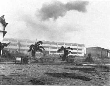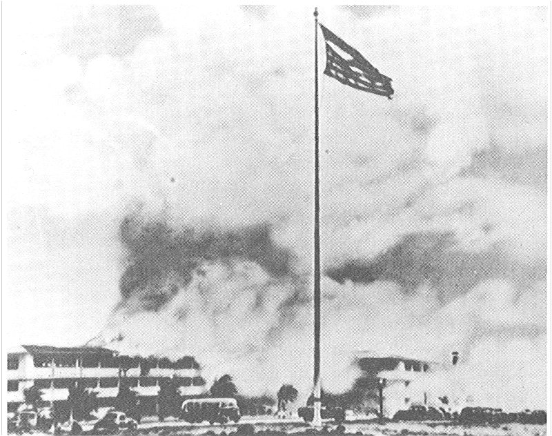 Above, gun emplacement (center) on parade ground at Hickam Field, with the big barracks burning in background. Serving today as headquarters of the Pacific Air Forces, this building has been known since 1948 as the Hale -Makai ("Home by the Sea" in Hawaiian). Below, Old Glory continues to wave over Hickam Field, bearing silent witness to the brutality of the Japanese attack. This same flag later flew above the United Nations