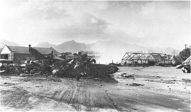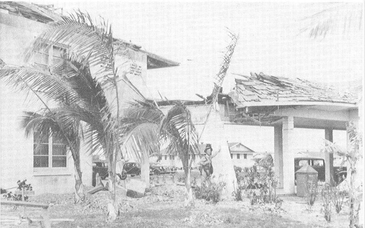 Badly damaged barracks of the 6th Pursuit Squadron, clouds of smoke to billow which suffered heavy casualties. (Joe K. Harding)