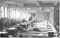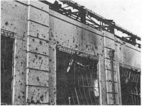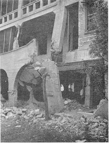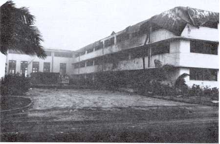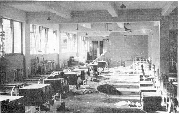 Wing L of Hickam Field's big barracks, with its fire-blackened, bullet-scarred walls and wrecked roof, was devastated by the attack. Mess hall is at left.