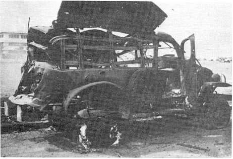 Mangled truck, still burning, parked on F Street next to the parade ground .(today's Headquarters Pacific Air Forces parking lot) .