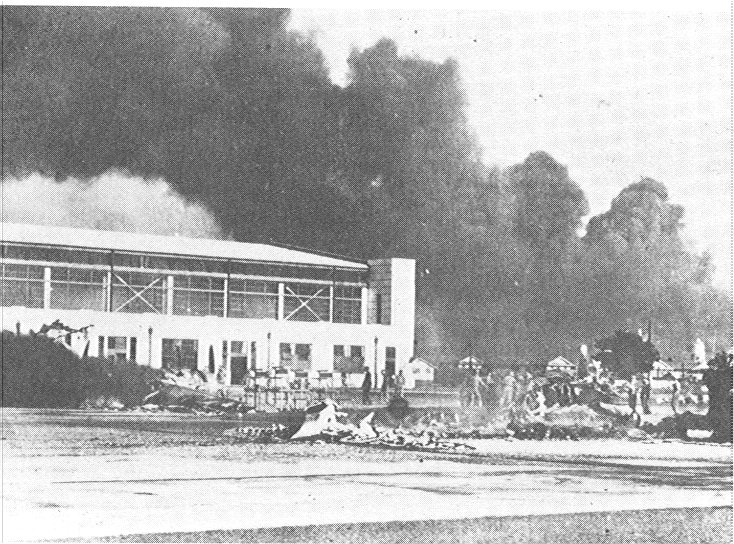 Hangar row at Wheeler Field, with Hangar 3 on the right and the burnt remains or tents which were hit hard by the attacking Japanese.
