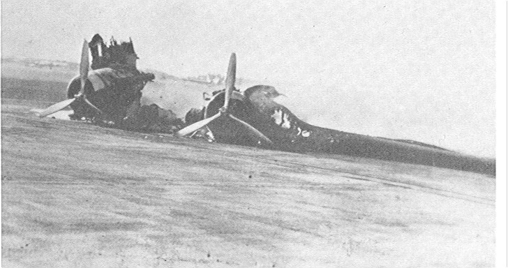 Field following the Japanese attack. Right, B -18 wreckage on the Hickam flight line. Below,