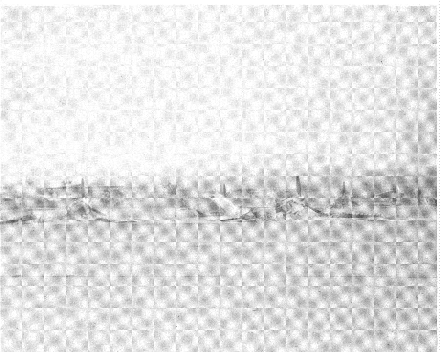Wrecked planes on Wheeler Field flight line, with Hangar 2 in background and (on the right) tent quarters where many enlisted men were killed.